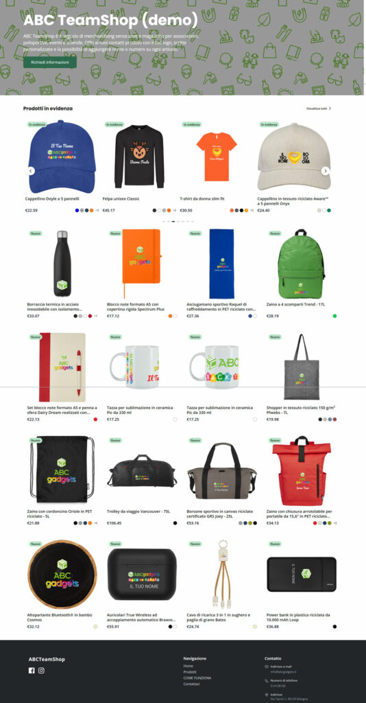 Se sei una associazione, una polisportiva, un’azienda o organizzi eventi, con la nuova piattaforma “merch-platform” di ABC Gadgets puoi avere in pochi giorni un negozio online personalizzato, con il tuo logo e la tua identità, e proporre prodotti utili come t-shirt, felpe, borracce, shopper e accessori… senza comprare nulla in anticipo!