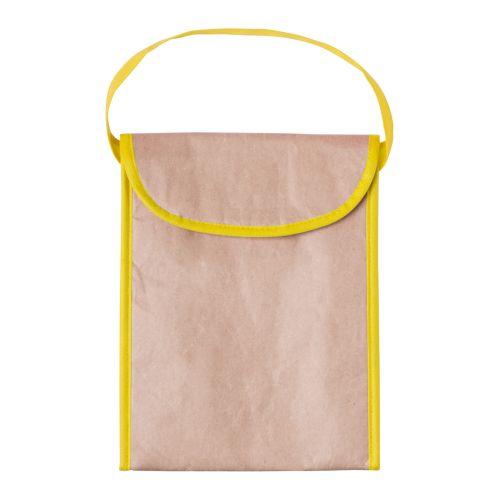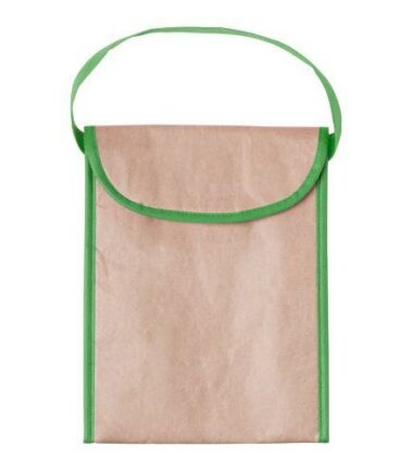 Borsa frigo ecologica per bimbi, realizzata in carta, con manico colorato e interno imbottito in alluminio, di dimensioni 20x26x9cm.