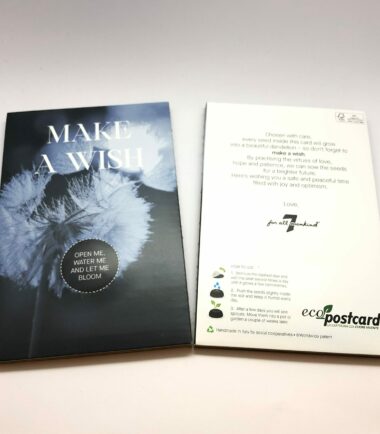 Le Eco-Postcard si possono personalizzare con stampa a colori, anche fotografica, su tutta la superficie, fronte e retro, e puoi scegliere tra un’ampia gamma di semi disponibili tra fiori, ortaggi e piante aromatiche.