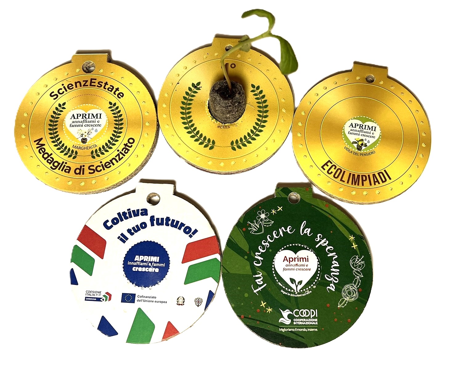 Medaglia ecologica, 100% made in Italy, realizzata in cartone riciclato accoppiato a carta certificata FSC, con all’interno una cialda di terra e i semi che, bagnati regolarmente, daranno vita ad una bellissima piantina. E’ possibile scegliere tra una vasta gamma di semi testati (fiori, ortaggi ed erbe aromatiche).