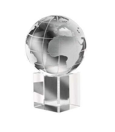 Fermacarte da scrivania in cristallo composto da base cubo e sfera globo. Personalizzabile con tampografia o incisione laser.