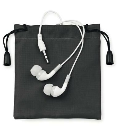 Cuffie auricolari fornite in sacchettino di tessuto con laccetti di chiusura, disponibili in bianco, blu, rosso, nero e personalizzabili con logo sul sacchettino.