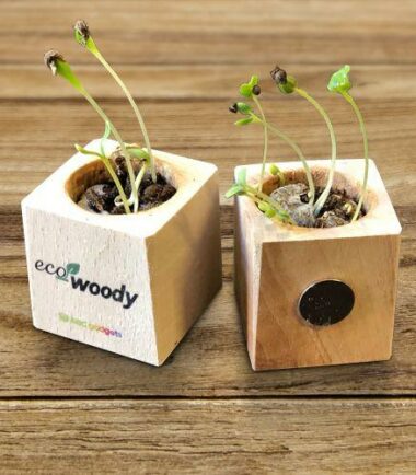 Cubo in legno magnetico contenente torba e semi per la coltivazione diretta all’interno del cubo, personalizzabile con logo a colori.