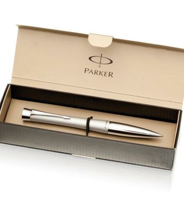 Penna gift Parker in acciaio, disponibile in varie tonalità, personalizzabile con logo, confezionato in elegante astuccio. Ideale come regalo aziendale.