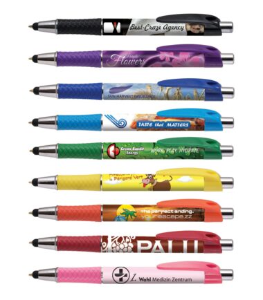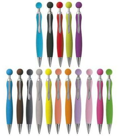 Penna a sfera in materiale soft touch, con clip in metallo e puntatore touchscreen per tablet e smartphone, dal design divertente e raffinato. Disponibile in 16 colori brillanti, piacevolissima da tenere in mano, garantisce un'ottima resa di stampa del lo