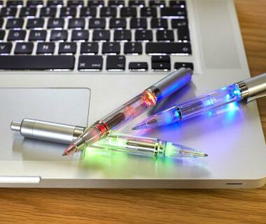Penna a sfera, fusto trasparente con luce colorata, refill blu, batterie incluse. Dimensioni 14x1,5cm. disponibile con luce bianca, verde, viola e rosa, personalizzabile con logo.