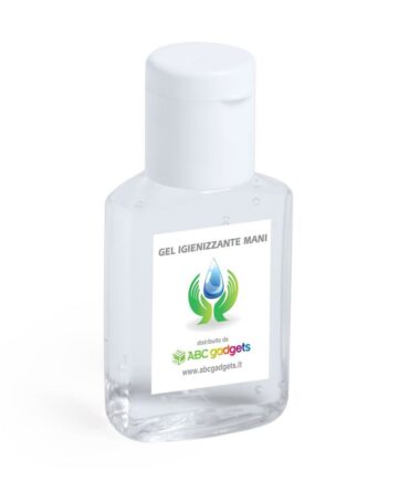 Gel igienizzante per le mani, in flacone da 30ml, personalizzabile con etichetta stampata a colori.