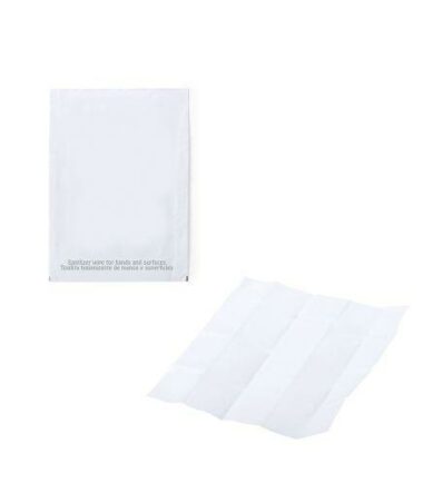 Salviettina monouso disinfettante per le mani, fornita in bustina personalizzabile.