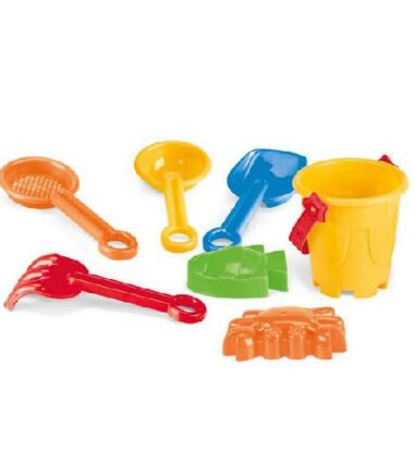 Set composto da secchiello e 6 giochi assortiti (paletta, rastrello, formine), personalizzabile con logo su ampia area di stampa, disponibile in tante combinazioni di colori.