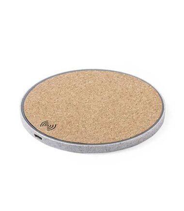 Caricatore wireless ecologico in sughero e fibra di grano, personalizzabile con logo.