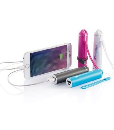 Mini powerbank 2200 mAH da borsetta (dimensioni 10x2cm), cordino coordinato. Disponibile in rosa, bianco o grigio. Batterie incluse. Personalizzabile con logo.
