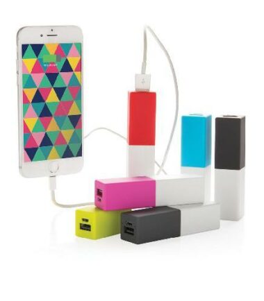 Powerbank 2200 mAH in abs e materiale soft touch, dimensioni 9x2x2cm. Disponibile in tante tonalità vivaci e brillanti. Micro cavo USB incluso. Personalizzabile con logo.