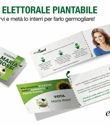 Eco-Card santino elettorale ecologico e biodegradabile con semi incorporati, personalizzabile a colori su tutta la superficie, disponibile sia nel formato singolo che in quello doppio.